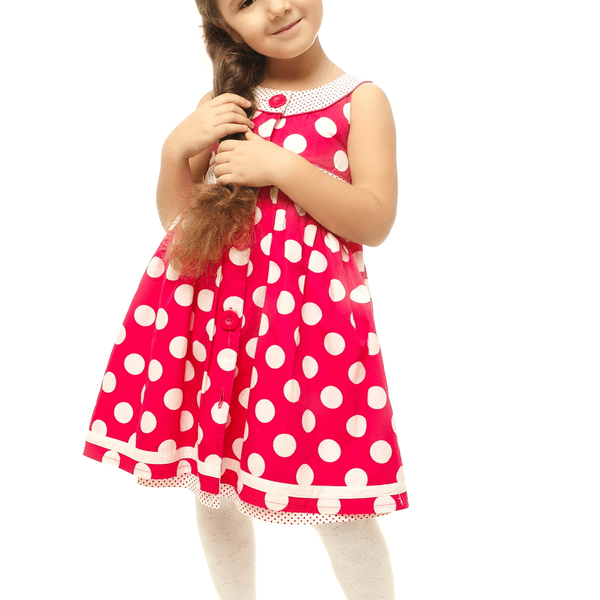 Add a touch of vintage charm to her wardrobe with this vibrant magenta polka dot dress. Featuring a classic A-line silhouette, this sleeveless dress is crafted from soft, breathable cotton, making it perfect for parties or sunny days. The design is elevated by a contrasting white dotted collar and large decorative front buttons. The flared skirt provides a playful, comfortable fit that is easy to move in.