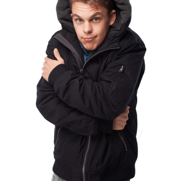 Engineered for maximum warmth and style, this heavyweight hooded bomber jacket is the ultimate winter essential. It features a high-density water-resistant outer shell and a thick grey fleece-lined hood for superior insulation against the cold. The classic bomber silhouette is updated with ribbed cuffs and a matching hem to lock in heat, while the utility sleeve pocket adds a functional streetwear touch.