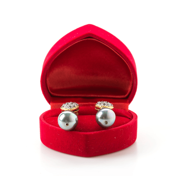 Exude timeless elegance with these exquisite grey pearl earrings. Each earring features a lustrous, iridescent dark pearl topped with a crown of sparkling small-cut diamonds set in a 14k gold-tone mounting. These studs offer a perfect balance of classic luxury and modern sophistication. Presented in a premium red velvet heart-shaped jewelry box, this set is an ideal choice for bridal wear, anniversary gifts, or special evening occasions.