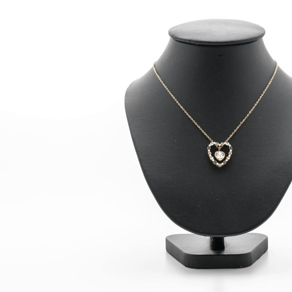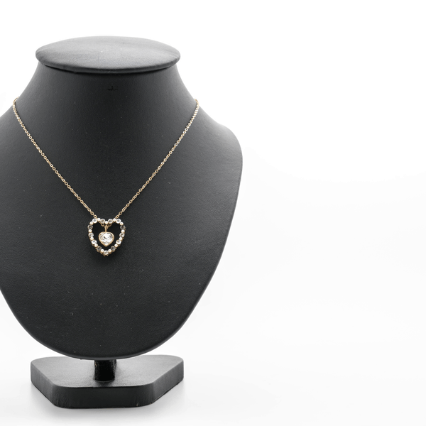 An exquisite gold-tone necklace featuring a unique "heart-within-a-heart" pendant. The outer heart is delicately encrusted with shimmering micro-crystals, while a polished crystal heart sits at the center, creating a beautiful layered effect. This sophisticated piece comes on a fine cable chain, making it a perfect accessory for formal events, weddings, or as a high-end gift.