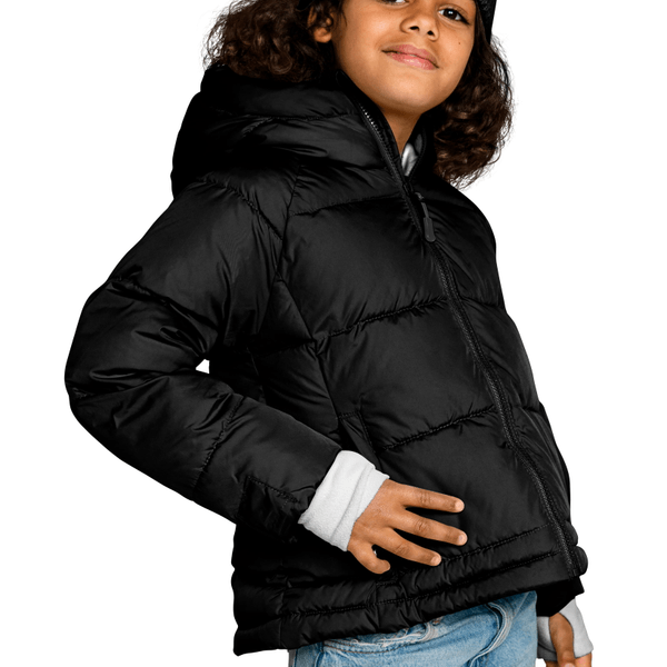 Keep them warm and stylish with this heavyweight hooded puffer jacket. Designed for ultimate insulation, it features a quilted water-resistant outer shell and a full-length zipper closure. The jacket includes integrated thermal thumbhole cuffs in light grey to keep hands warm and sleeves in place. Its sleek matte black finish and relaxed fit make it a versatile piece for any winter wardrobe, blending functionality with a modern streetwear aesthetic.